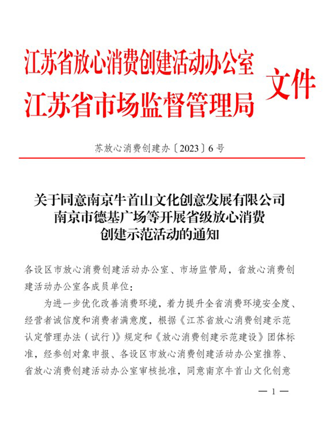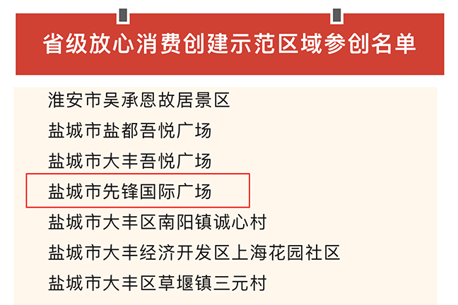 日前,江蘇省放心消費創(chuàng)建活動辦公室、江蘇省市場監(jiān)管局發(fā)布了2023年度江蘇省級放心消費創(chuàng)建示范單位、示范區(qū)域參創(chuàng)名單,集團先鋒國際廣場成功入選了省級放心消費創(chuàng)建示范區(qū)域參創(chuàng)名單。