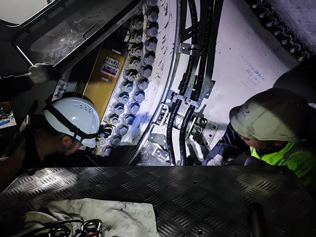 面對復(fù)雜海況,運維團隊同步完成多項關(guān)鍵作業(yè):對#01、#04風(fēng)機蓄能器支架實施技改以提升設(shè)備穩(wěn)定性;快速處理#19風(fēng)機偏航液壓站缺陷以恢復(fù)風(fēng)機運行;在顛簸的船上和高空機艙內(nèi),團隊將“精益運維”落實到每個細節(jié)。