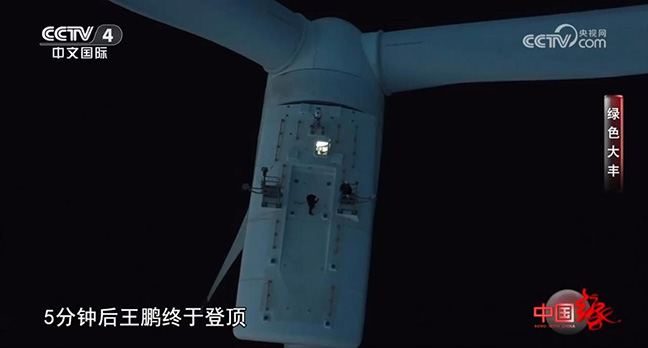 傍晚,風電場的運維人員王鵬要對15號風機進行檢修,馬諾打算一同前往。這座風機出水高度約120米,相當于40層樓高,為了保證上機人員的安全,他們必須要穿戴好特制的防護裝置。要想進入風機內(nèi)艙,馬諾和王鵬要先爬到風機外部10米高的平臺上,由于上風機的難度很大,程序繁瑣,王鵬每次都會提前準備好所有的物資,用繩子吊上去。